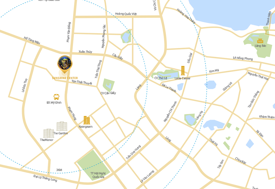 Sunshine Center nằm ngay trên mặt đường Phạm Hùng – trục đường huyết mạch liên kết khu vực phía Tây và Nam Hà Nội. Đây cũng là trung tâm hành chính mới của thủ đô với hạng loạt công trình văn hóa, hành chính, kinh tế mới được xây dựng, như TT Thể thao Quốc gia, Trung tâm Hội nghị Quốc gia, một số landmark nổi bật như Keangnam BigC và đồng thời cũng là khu vực có nhiều dự án chung cư cao cấp nhất, tạo ra một hệ sinh thái đô thị hoàn thiện.